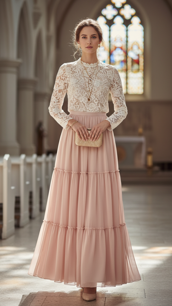 Pair your tiered skirt with a classic lace blouse featuring intricate lace detailing along the neckline or sleeves. This combination balances feminine charm with appropriate coverage for religious settings. The clean styling approach ensures your outfit maintains the sophisticated appearance that’s ideal for worship services.