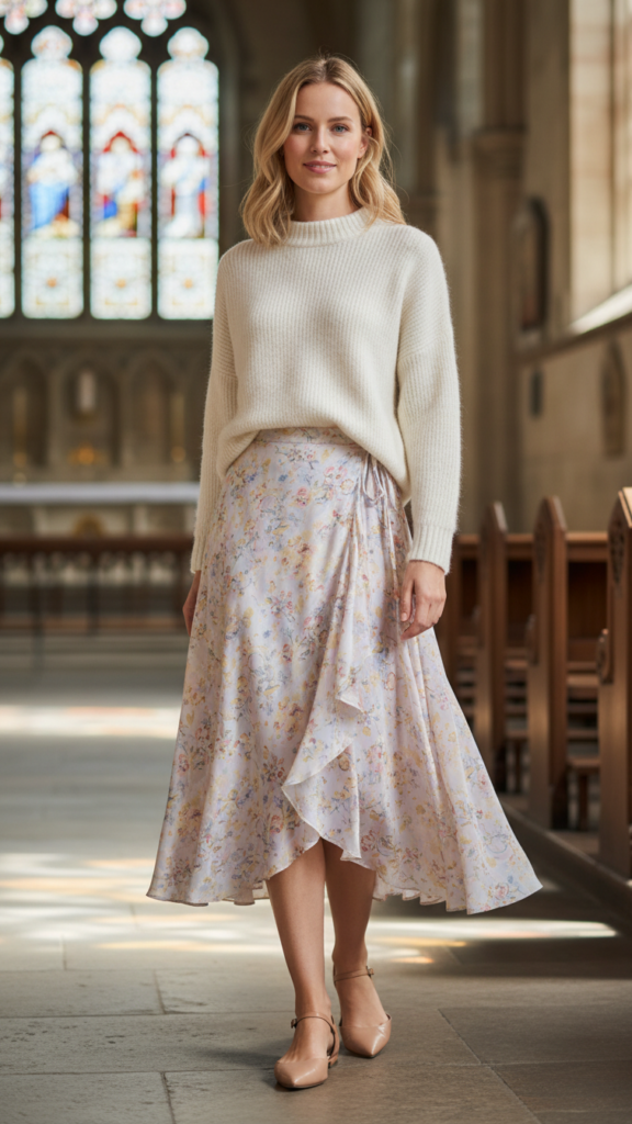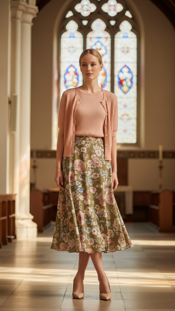 Select a floral pattern with muted tones rather than bold, attention-grabbing colors. Pair your skirt with a solid-colored twin set that complements one of the flowers’ hues for seamless color coordination. Choose nude heels to elongate your legs while maintaining sophistication. This combination allows you to express your personal style while respecting traditional church dress expectations with charm.