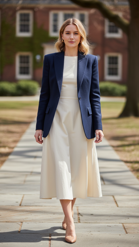 When you’re searching for a sophisticated yet comfortable graduation outfit, the blazer and midi dress combination delivers timeless elegance that works for any ceremony. This pairing creates a customized silhouette that flatters every body type while maintaining professional polish.