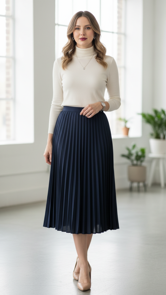 Elevating your graduation look becomes effortless when you pair a pleated midi skirt with a fitted turtleneck for sophisticated polish. The A line midi skirt silhouette creates a graceful foundation that flatters various body types while maintaining professional appeal.