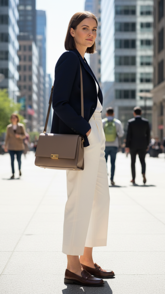 Choose high-waisted culottes in navy, charcoal, or cream for maximum versatility. Your blazer should fit perfectly through the shoulders and waist, creating clean lines that enhance the entire look. Complete this ensemble with elevated loafers in leather or suede, which provide comfort for walking across stages while maintaining polish.