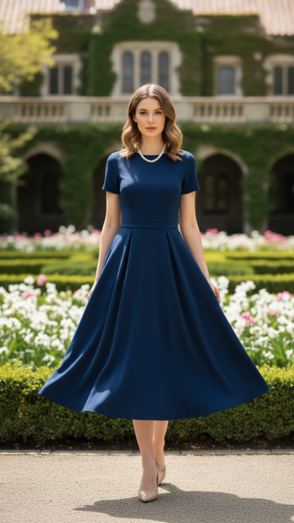 When you want to embody timeless elegance for your graduation ceremony, a classic fit-and-flare dress creates the perfect foundation for sophisticated celebration attire. Choose a knee-length or midi dress in navy, black, or deep burgundy for versatility and refinement. The fitted bodice and flared skirt naturally complement your silhouette while maintaining appropriate coverage.