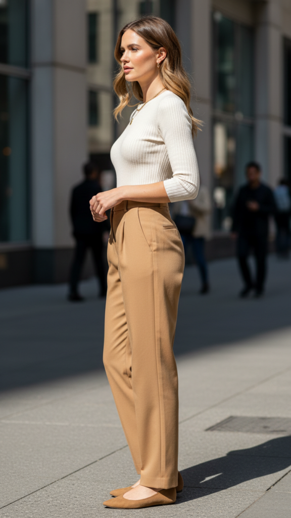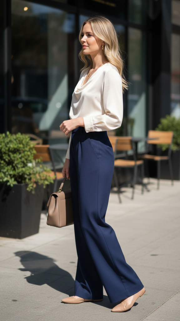 Choose wide-leg or straight-cut trousers in navy, charcoal, or camel for versatility. Your tucked in blouse with high waisted trousers creates a flattering silhouette that elongates your torso.