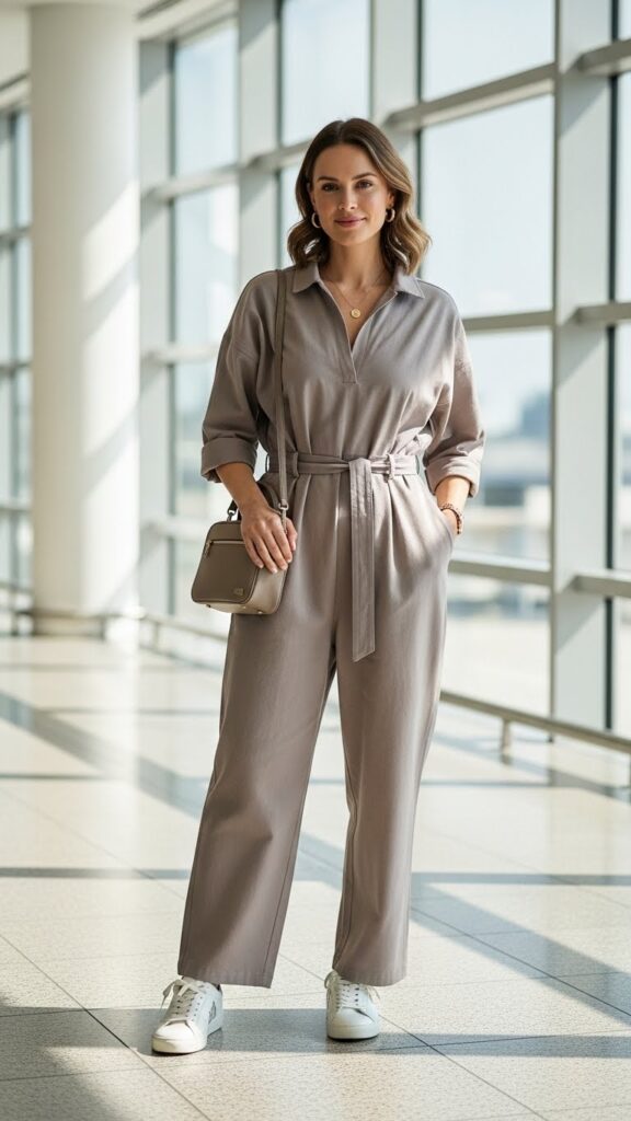 A comfortable jumpsuit might be the ultimate one-and-done airport outfit. You literally put on one piece of clothing and suddenly have an entire outfit. The efficiency is unmatched.