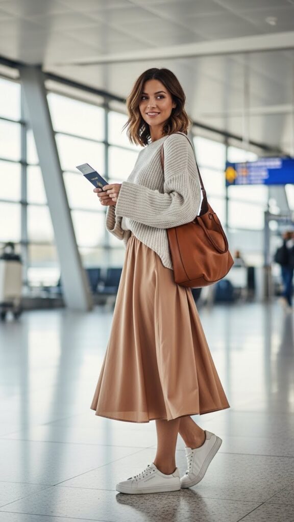 Choose a flowy midi skirt in a jersey or cotton fabric that won’t wrinkle. Pair it with a chunky oversized sweater that you can tuck in slightly at the front for shape (or leave fully out for maximum coziness). Finish with white sneakers or ankle boots depending on your destination.
