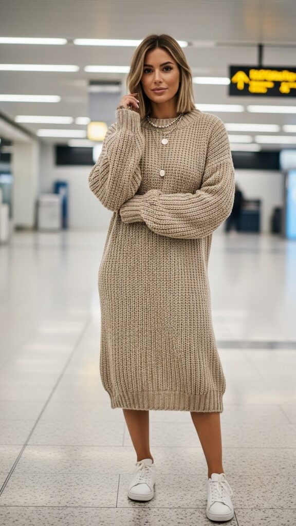 Look for a midi-length dress in a soft knit fabric, preferably with some stretch. Neutral colors like oatmeal, camel, or grey are versatile, but a deep jewel tone can be really striking too. The sneakers ground the look and make it clear you’re ready to move through the airport efficiently.