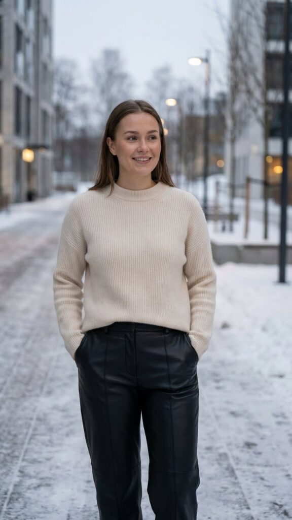 Winter date night outfit ideas perfect for staying warm while looking stylish. Add leather details through accessories like a structured belt or ankle boots to tie the look together. Choose a fitted sweater in neutral tones like cream, camel, or black for maximum versatility. You can dress this outfit up with statement earrings or keep it minimal for a relaxed vibe. Either way, you’ll feel confident and stylish all night.