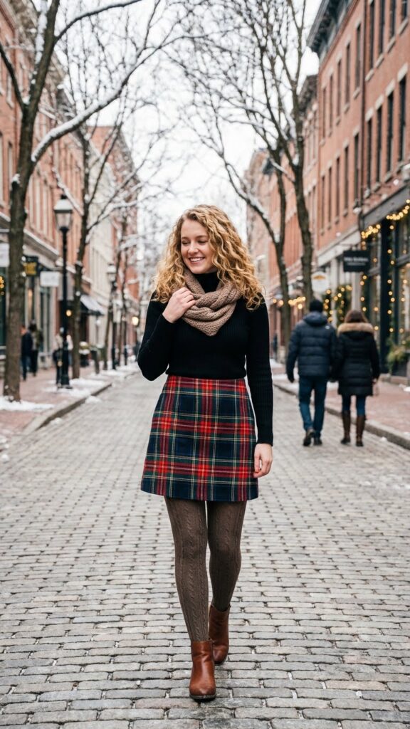 Pair your plaid skirt with a fitted turtleneck in a coordinating solid color. Choose a shade that pulls from the plaid’s secondary tones for a polished, cohesive appearance. This combination creates a balanced silhouette that flatters your figure.