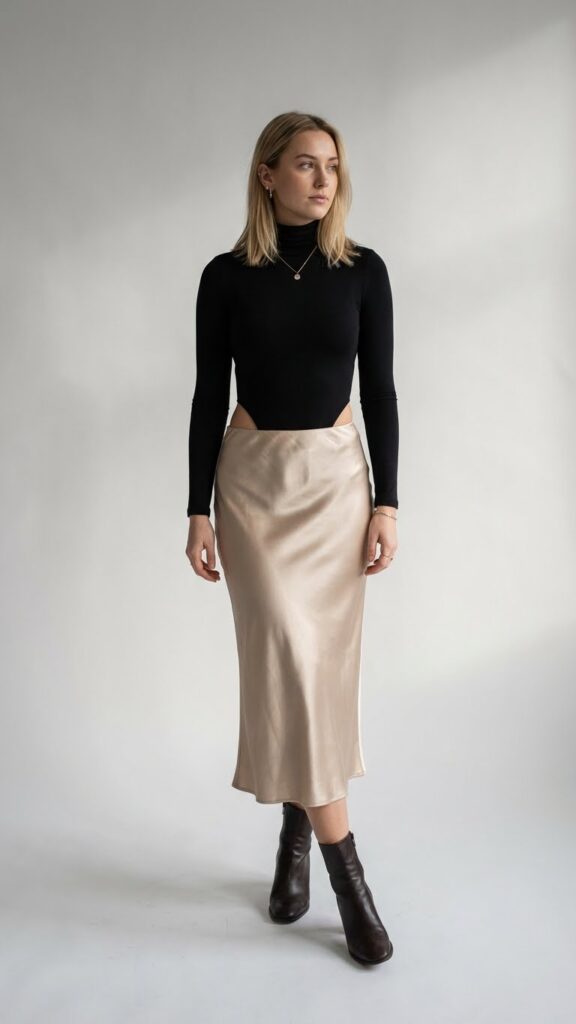 3Turtleneck Bodysuit Tucked Into a Satin Skirt