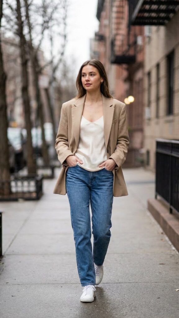 Choose a silk or satin camisole in a neutral shade like champagne, black, or ivory. The delicate camisole silhouette adds a touch of romance underneath the structured blazer. Pair these pieces with your favorite straight-leg or slim jeans for balance. Stylish cold-weather date outfit essentials can help complete the outfit with the perfect accessories.