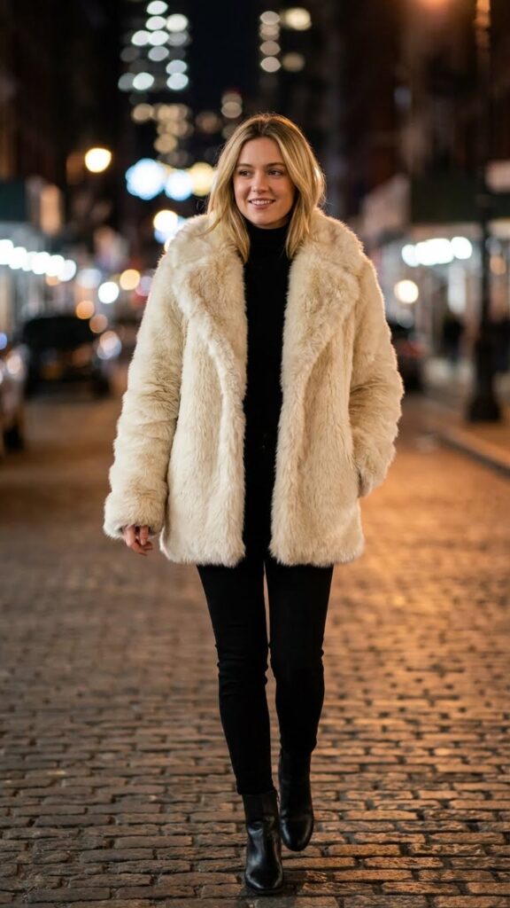 When you want maximum impact with minimal effort, an all-black outfit topped with a luxurious faux fur coat delivers instant sophistication. This combination creates a sleek silhouette that’s both dramatic and effortlessly chic for your winter date night.