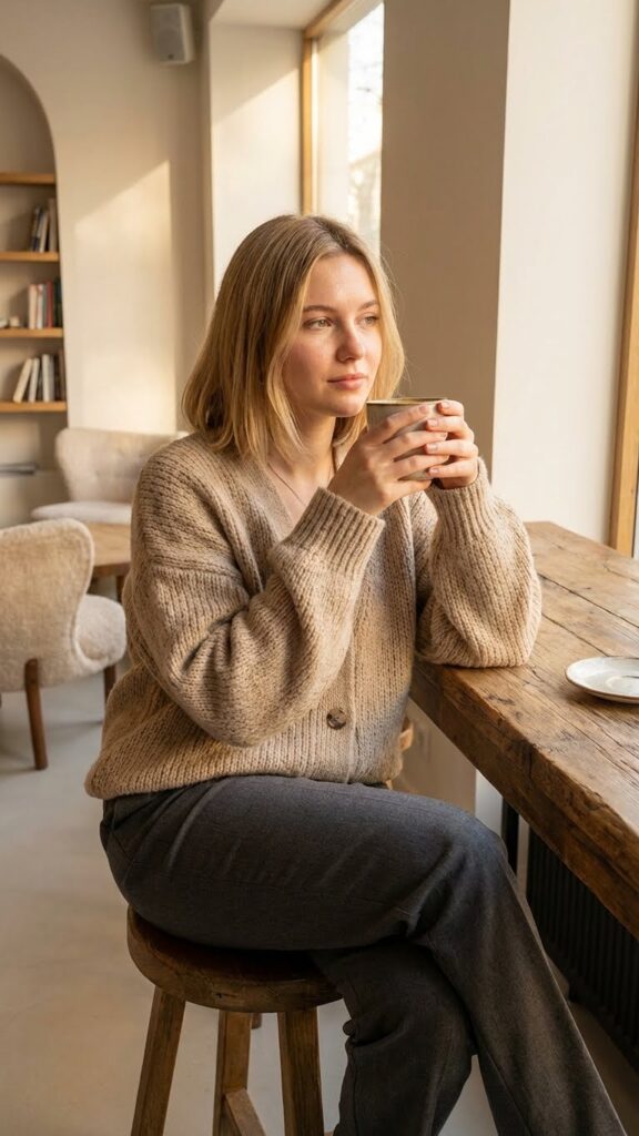 A chunky cardigan paired with custom-fitted trousers creates the perfect balance between cozy comfort and polished elegance for your winter date night.