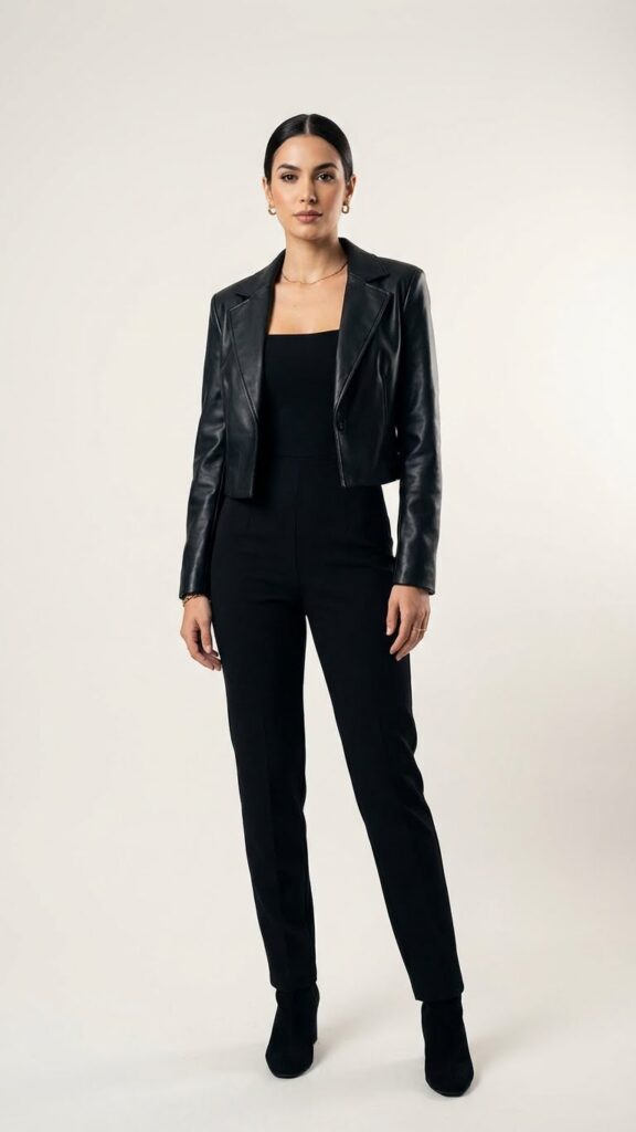 You’ll love how this combination balances comfort with polished elegance. Choose a jumpsuit in solid black, navy, or deep burgundy to achieve a minimalist aesthetic that feels timeless. A structured cropped jacket adds dimension without overwhelming your frame.