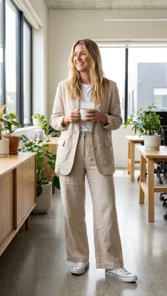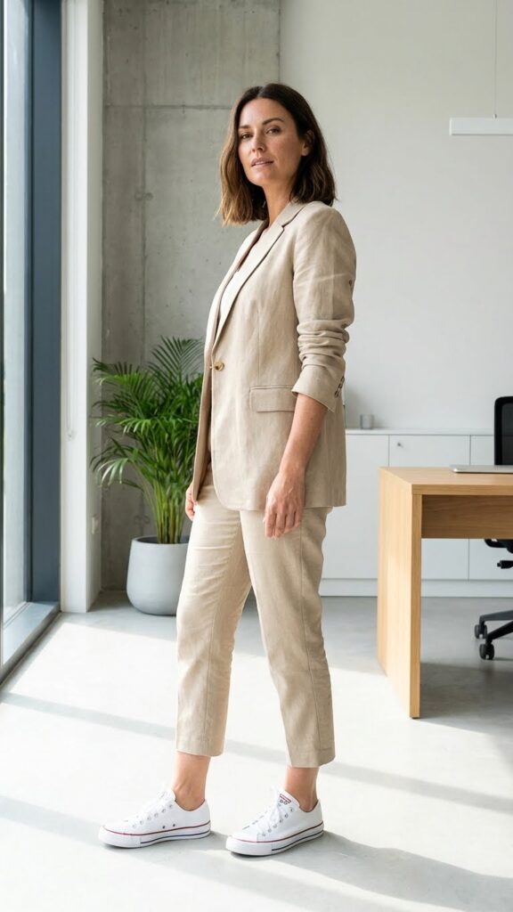 This one’s basically the gateway drug into sneaker-at-work territory. A structured blazer paired with tailored trousers and clean white Converse? It’s giving boss energy with zero pretension.