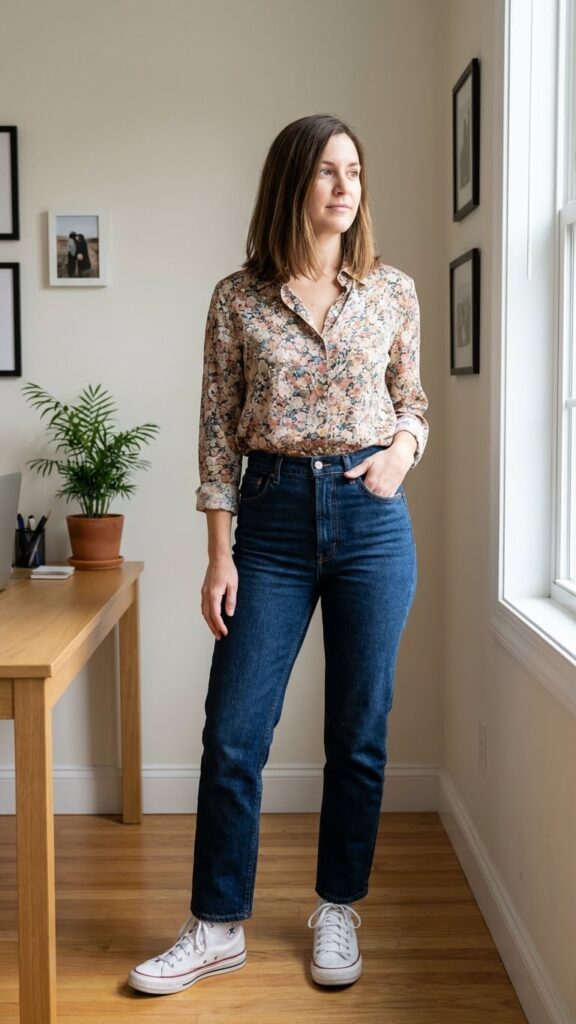 Some offices are jeans-friendly, and if yours is? You’ve hit the jackpot. Dark wash, high-waisted straight legs with white Converse is basically the casual office outfit formula that never fails.