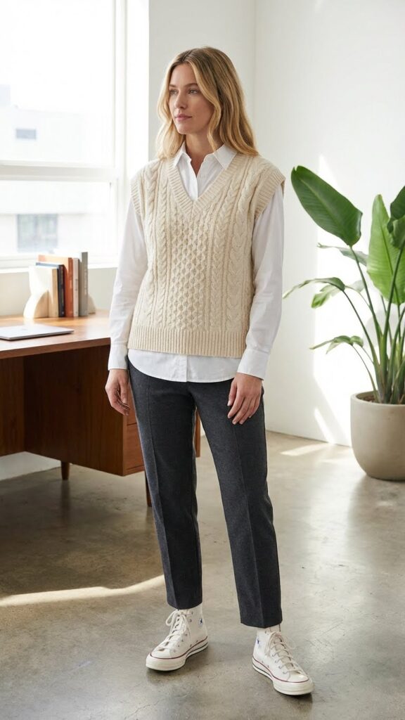 This Converse office look works with trousers, midi skirts, or even dressy shorts if your workplace allows it. Play with textures—a cable-knit vest over a crisp cotton shirt hits different than a plain one.