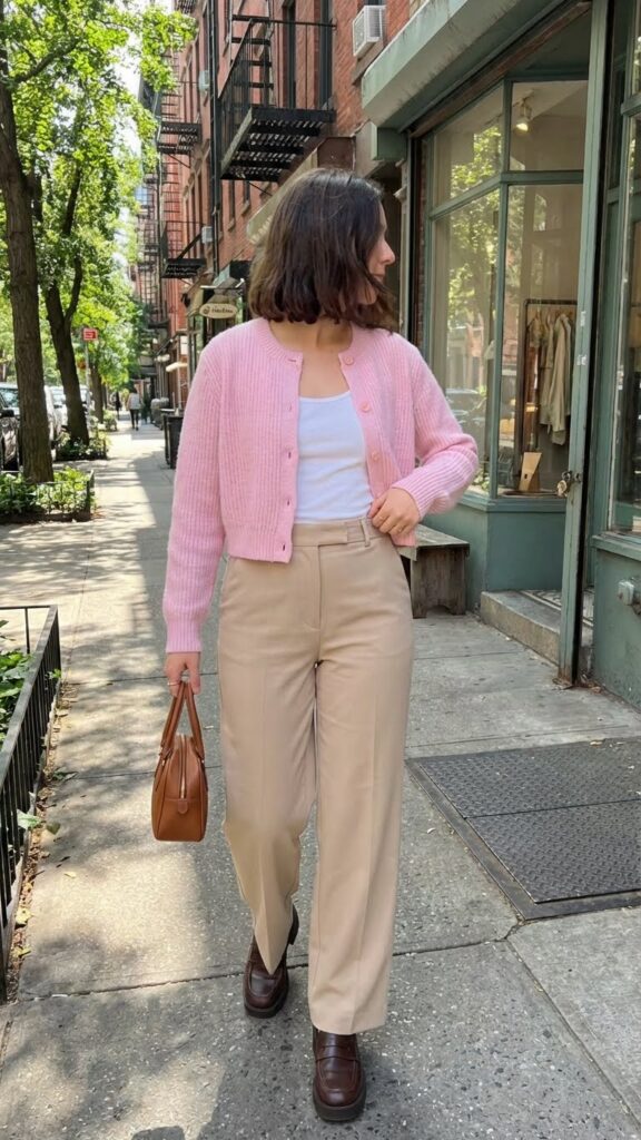 Button the cardigan all the way up or leave it slightly open over a simple tank or tee. The high waist of the pants is key here—it creates that vintage-inspired proportion that’s so coquette-core. Add platform loafers or heeled mules to complete the look. IMO, this is one of those outfits that looks way more expensive than it actually is ✨