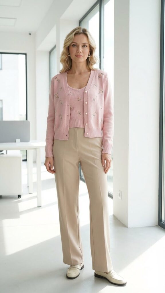 Matching cardigan sets are chef’s kiss for office coquette vibes. Go for baby pink, lavender, or powder blue—colors that feel soft and approachable. The twin-set trend is back and better than ever, giving you that polished, coordinated look without trying too hard.