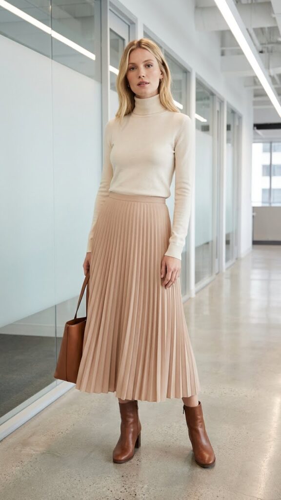 Go for skirts in soft neutrals or even a subtle plaid pattern. The turtleneck keeps things professional while the skirt brings all the feminine energy. Add ankle boots or Mary Janes, and honestly, this is the kind of outfit you’ll want to wear every single day.