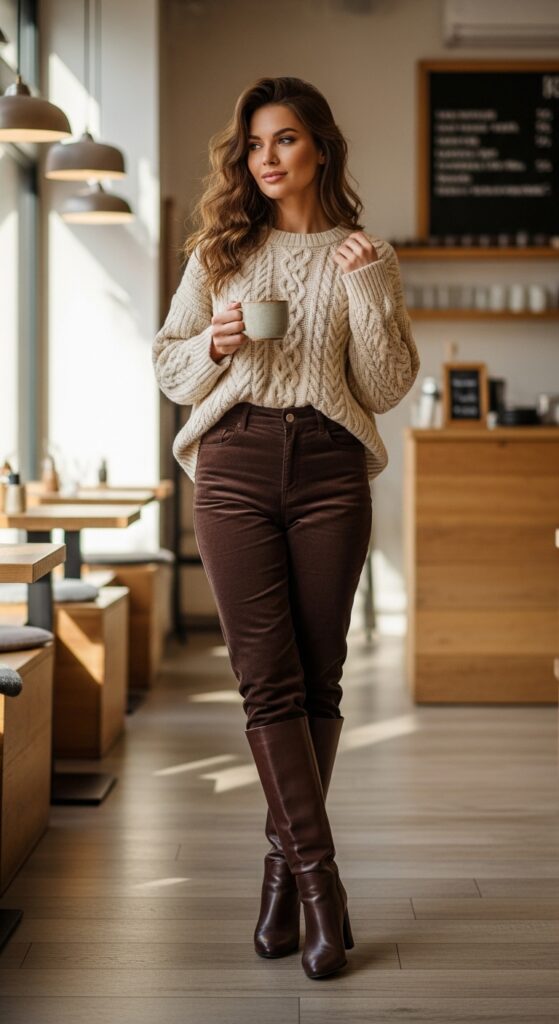 Go for a cream cable knit sweater that hits right at your hip, then tuck the front loosely into your high waisted corduroy trousers. Brown or camel cords work beautifully here. Slide into those knee high boots, whether leather or suede, and you’re basically a walking Pinterest board.