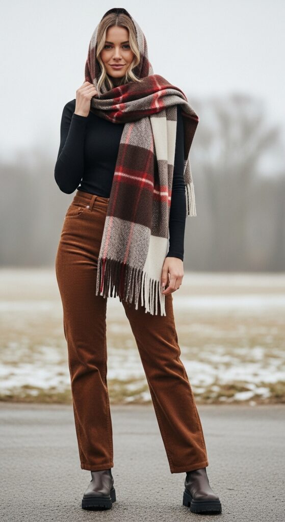 Keep your top simple with a fitted mock neck or basic long sleeve in white or black. Your corduroy trousers do the textural heavy lifting while an oversized blanket scarf in plaid or a complementary solid color wraps everything in warmth. Add chunky ankle boots and you’re ready to face the cold in style.
