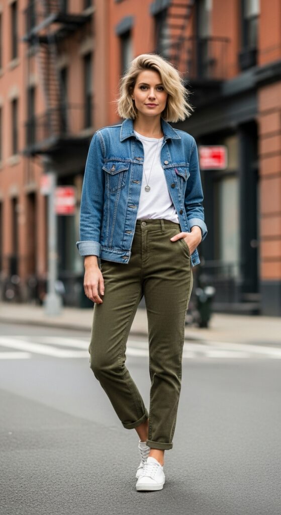 A classic medium wash denim jacket over a simple white tee, tucked into brown or olive corduroy trousers, is effortlessly cool. The different textures play off each other beautifully. White sneakers keep it casual while ankle boots add a slightly more polished edge.