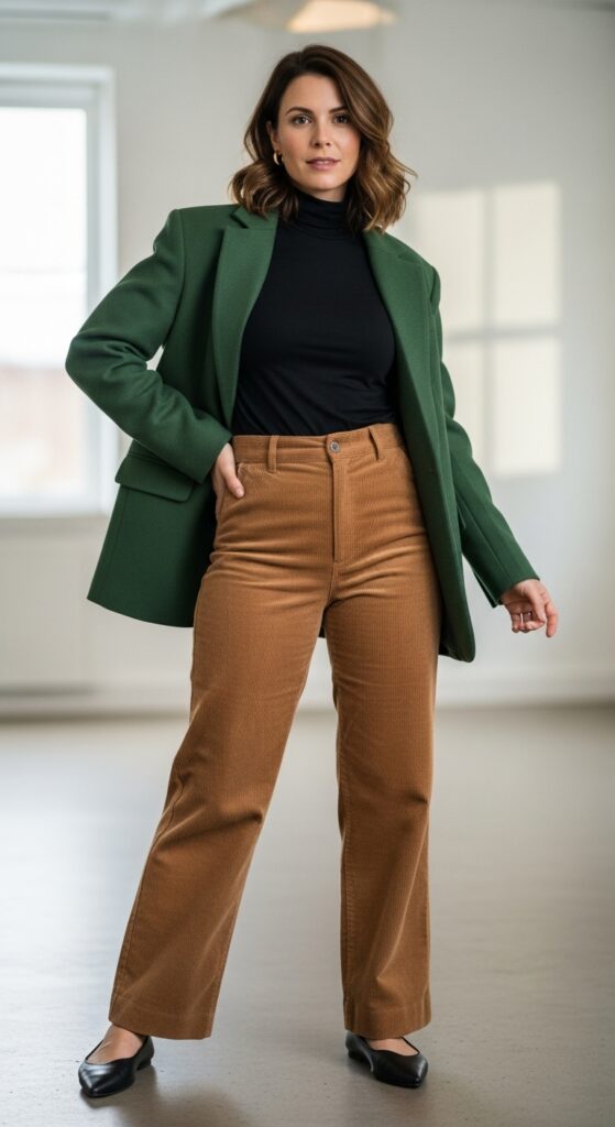 A fitted black turtleneck tucked into wide leg corduroy trousers creates such a clean base. Layer an oversized wool blazer on top, maybe in a complementary shade like forest green or burgundy, and suddenly you’re giving boss vibes. Add pointed toe flats or low heeled boots to keep things sophisticated.