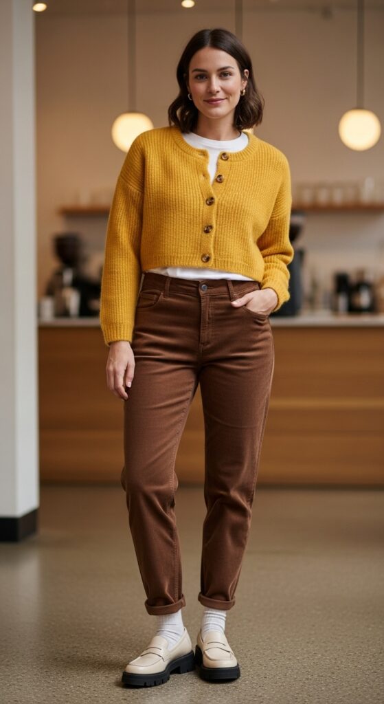 Pair your corduroy trousers with a cropped cardigan in a fun color like mustard, sage, or dusty rose. Wear it buttoned up as a top or layer it over a simple white tee if you’re feeling more casual. Chunky loafers are non negotiable here because they bring that scholarly chic energy.
