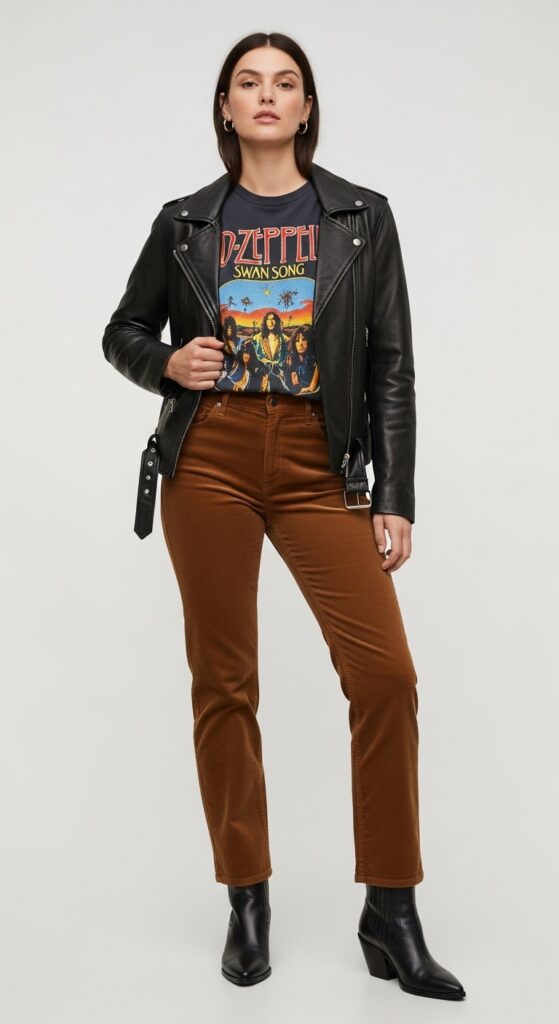 This outfit proves corduroy trousers aren’t just for cottage core dreams. They can absolutely handle a little rock and roll energy.
