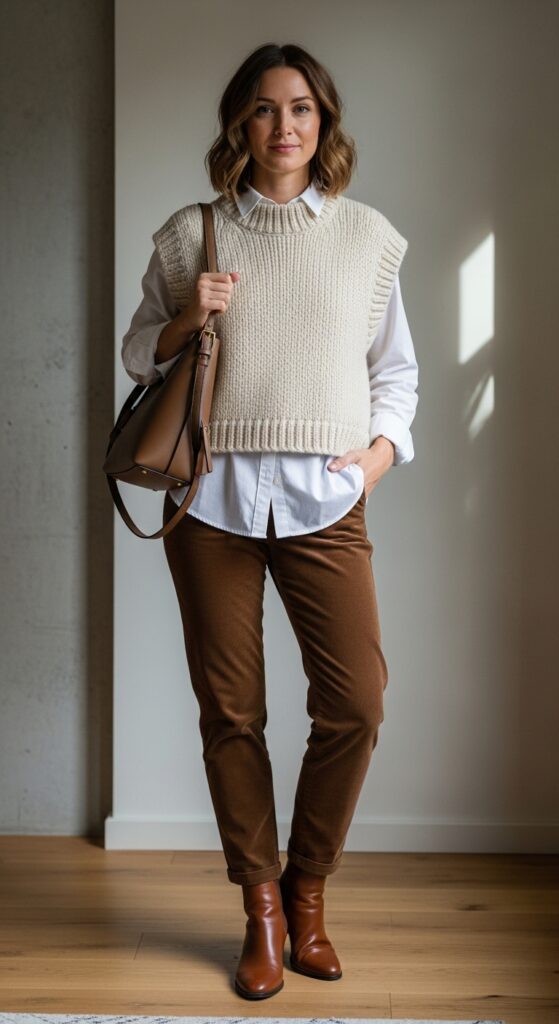 Start with a crisp white shirt, then add a chunky knit vest in cream, brown, or even a fun pattern. Your corduroy trousers anchor the look while the vest adds that cozy texture contrast. Finish with ankle boots and a structured tote bag.
