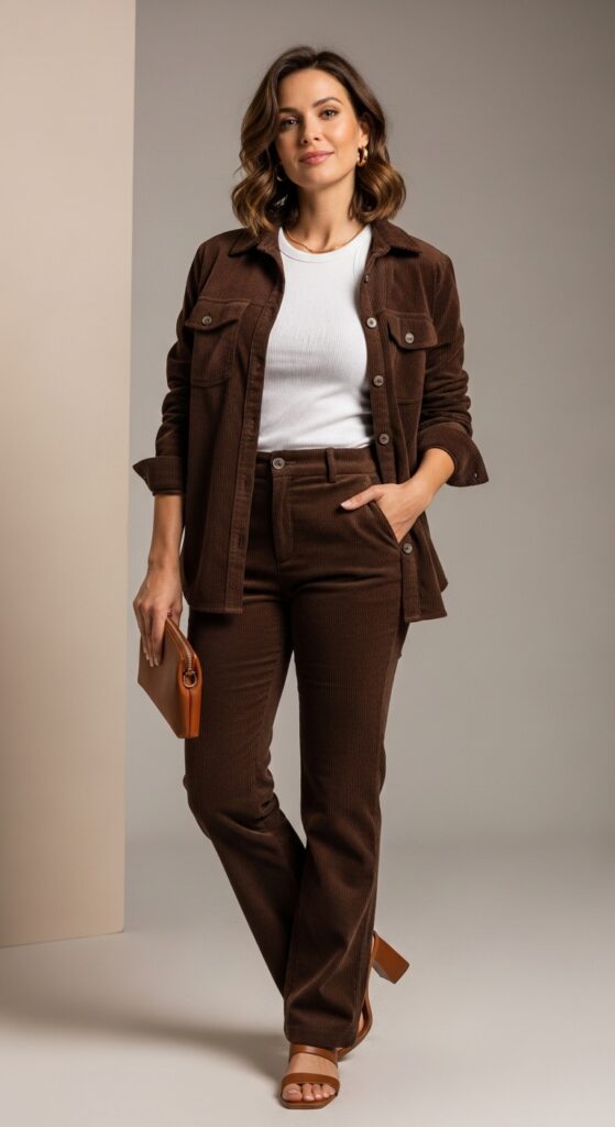 A matching corduroy shirt jacket with coordinating trousers creates such a cohesive, elevated look. Wear the jacket open over a fitted white tank or closed as a top depending on your vibe that day. Neutral shades like chocolate brown, forest green, or rust make this monochromatic moment feel intentional rather than overwhelming.