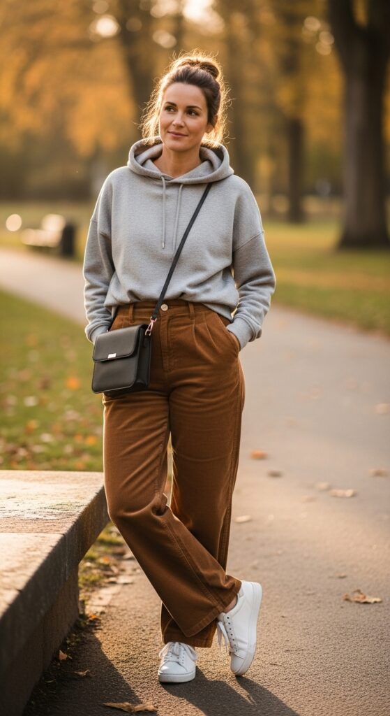 Pair your cords with a slightly oversized hoodie in a neutral shade like grey, cream, or navy. Keep the trousers high waisted so you can tuck the front of the hoodie in for some shape. Clean white sneakers and a simple crossbody bag pull everything together.