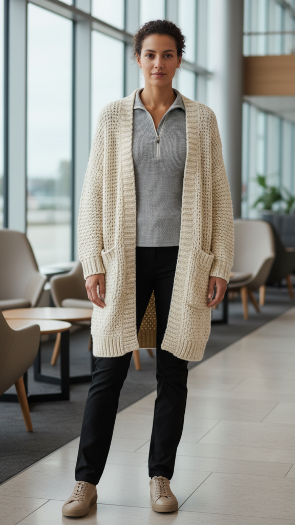 Choose cardigans with deep pockets for storing essentials and opt for breathable fabrics that won’t overheat you indoors while maintaining warmth. The key to successful winter travel outfits is selecting pieces that work together to maintain both comfort and style throughout your journey.