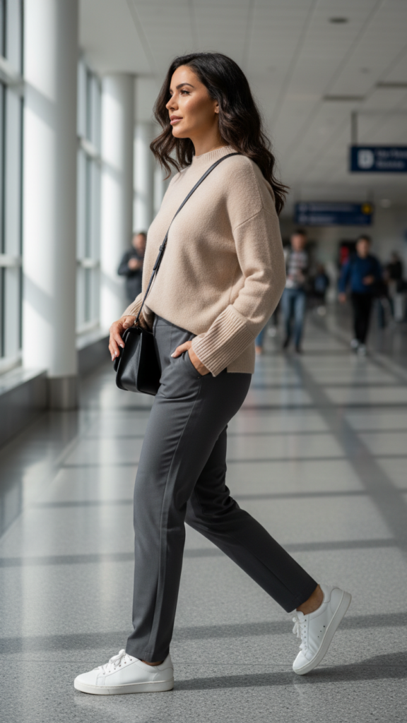 Versatile trouser options include wide-leg ponte pants, soft joggers with customized cuts, or stretchy travel pants that won’t wrinkle. Add slip-on sneakers or loafers for easy security checkpoint mobility. This combination gives you complete movement freedom while maintaining a sophisticated appearance throughout your excursion.