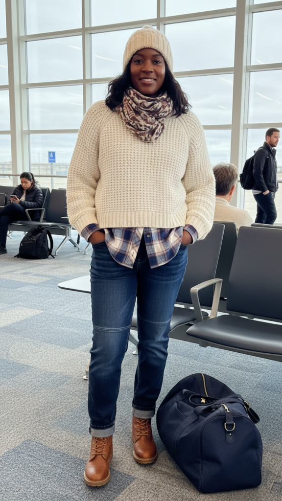Complete this comfortable ensemble by adding a soft flannel shirt underneath your sweater for extra warmth without bulk. Top it off with a chunky knit beanie that’s easily removable during security checks, giving you practical style that adapts to changing temperatures throughout your expedition. This travel-ready combination ensures you stay comfortable while maintaining a chic appearance from takeoff to landing.