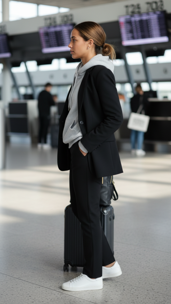 Modern airport fashion adopts unexpected combinations, and pairing a comfortable hoodie with a structured blazer creates the perfect balance of casual comfort and professional polish. You’ll uncover this contrast works beautifully when traveling between different climates and occasions.