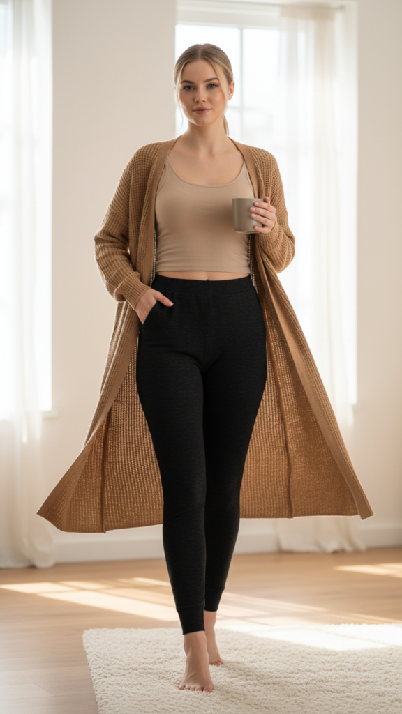 Start with a fitted tank top as your base, then add thermal leggings that provide excellent thermal insulation. Choose leggings with brushed interiors or merino wool blends for maximum comfort. Your long cardigan becomes the statement piece—pick one that reaches mid-thigh or knee-length for ideal coverage.