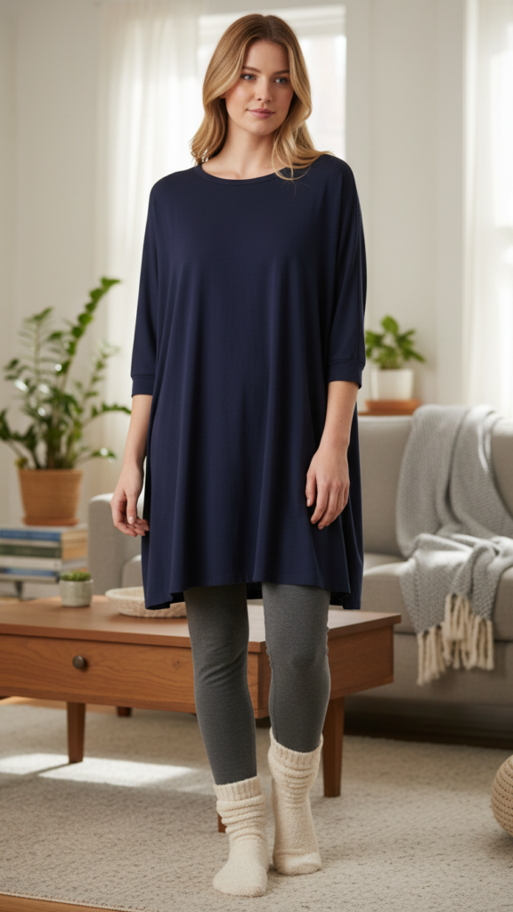 When you’re seeking maximum comfort without sacrificing style, pairing a tunic dress over thick cotton leggings creates an effortlessly cozy winter look. This combination delivers soft knit textures that feel gentle against your skin while keeping you warm throughout the day. Choose a tunic that falls mid-thigh for ideal coverage and movement freedom.