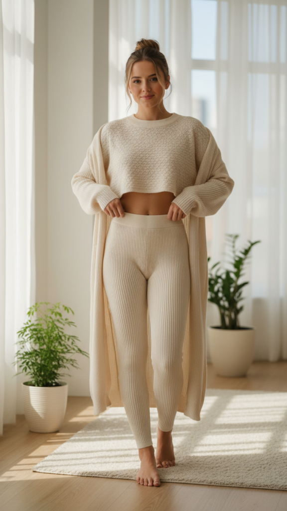 This combination works perfectly for video calls, casual gatherings, or lounging at home. You’re free to move comfortably while looking put-together throughout your day. Select ribbed or cable-knit textures for added visual interest and warmth. Neutral tones like cream, camel, or soft gray offer versatility, while jewel tones make bold statements. Layer a long cardigan from your set over the cropped knit top when temperatures drop further. Complete your cozy indoor look with boots for those moments when you need to step outside or want extra warmth around the house.