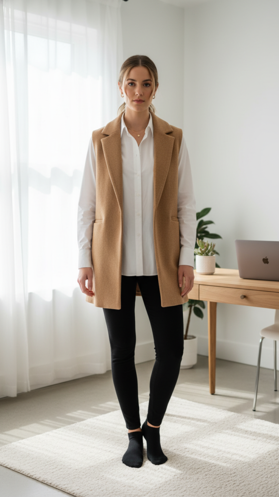 Choose crisp white or soft chambray shirts that tuck smoothly into high-waisted ponte styles. Your wool vest becomes the statement piece, offering versatile layering options throughout changing indoor temperatures. Select structured vests in neutral tones like camel, charcoal, or navy for maximum outfit coordination. You can unbutton your collar for casual comfort or keep it buttoned for formal meetings.