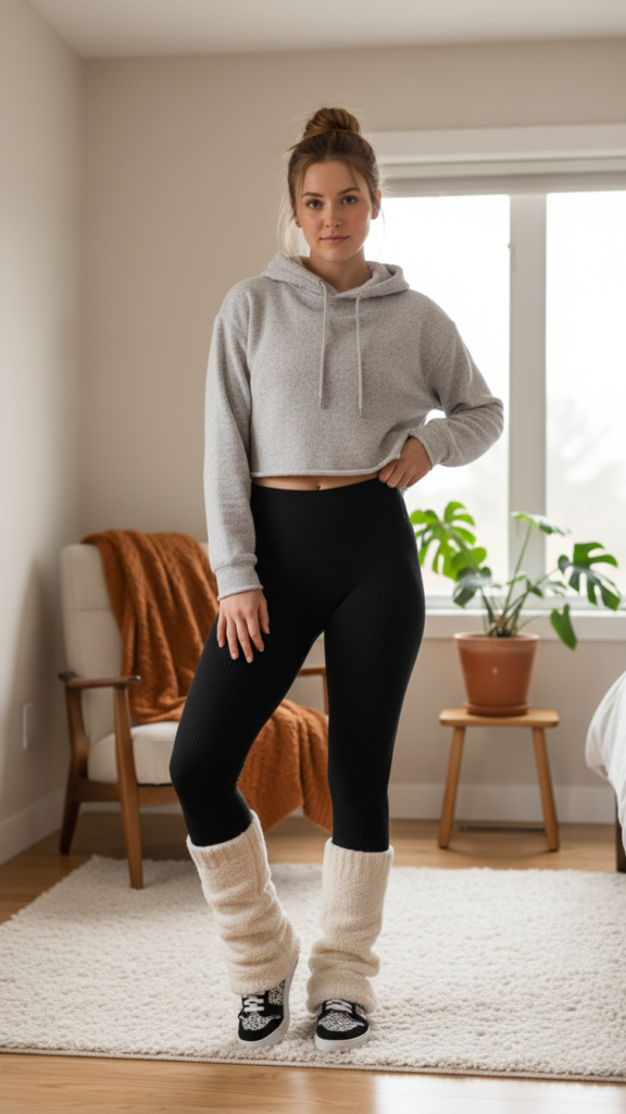 Layering a cropped hoodie with ribbed leggings and leg warmers creates the perfect athleisure-meets-cozy aesthetic for winter days. This combination lets you move freely while staying warm in your space. Choose ribbed leggings with good stretch that won’t restrict your movement during stretching or lounging. The textured fabric adds visual interest and helps retain body heat better than smooth materials.