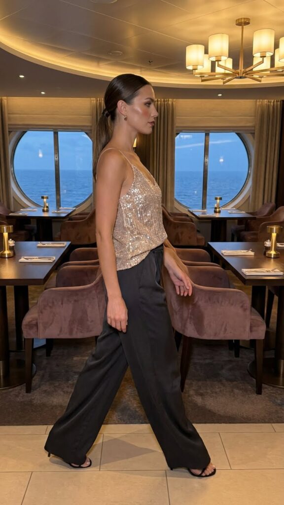 Pair them with a sequin or beaded cami and you’ve got instant glamour without any of the fuss. The sequins catch the light in the most flattering way while the relaxed pants keep things from feeling too done up. You know what I love about this combo? You can dance at the onboard club afterward without changing. The pants flow, the top sparkles, and you’re comfortable enough to actually have fun. A sleek ponytail and statement earrings complete this vibe perfectly.