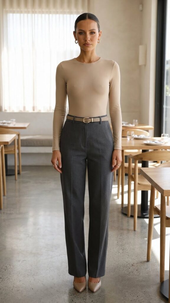 If you want to look polished without the fuss, this is your outfit. A fitted bodysuit tucked into high-waisted tailored trousers creates clean lines that just look expensive, even if you snagged everything on sale (no judgment, that’s smart shopping).