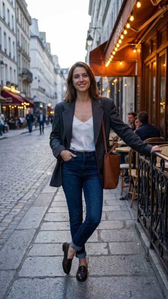 Heels or heeled boots work perfectly here, and a clutch or small shoulder bag completes the look. This outfit proves you can absolutely wear jeans to a nice dinner and still look put-together.