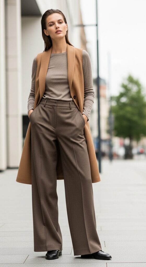 Choose a vest in camel, tan, or even a textured knit for extra visual appeal. The elongating effect of the vest creates a sleek silhouette that’s incredibly flattering. Keep your base layer simple and fitted so the vest can be the star. Loafers or heeled boots work beautifully here, and a medium-sized shoulder bag balances out the proportions. This look is perfect for transitional weather or for those in-between seasons when you need layers but don’t want a full coat yet. It’s also great for office settings where you want to look professional but still fashion-forward.