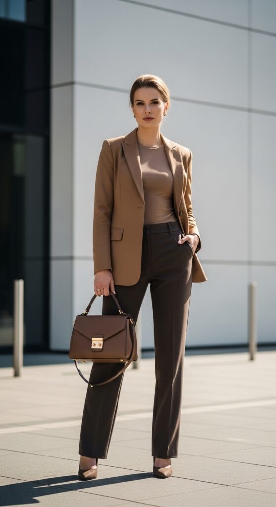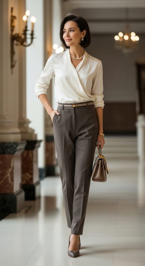 Want to feel fancy without actually going anywhere fancy? A silk blouse in champagne, ivory, or even a soft blush pink paired with dark beige trousers is pure elegance. This combo takes neutral dressing to a luxurious level.