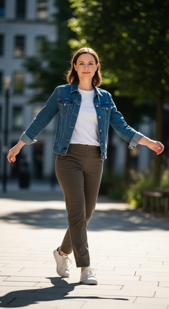 You can never go wrong with a denim jacket. It’s the ultimate casual layering piece, and when you throw it over a simple top and dark beige trousers, you get this easygoing, approachable style that still looks really good.