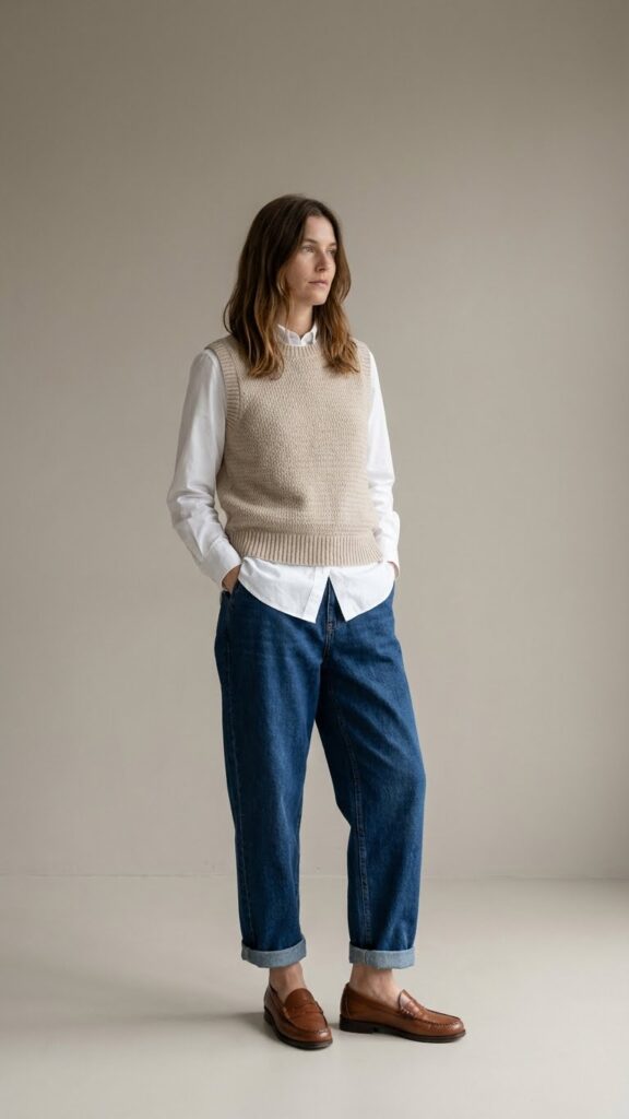 This outfit gives major student-chic energy but in the best possible way. You look scholarly and stylish without being stuffy. Add loafers or Mary Janes, and consider layering some delicate necklaces over the vest for extra visual interest. The collared shirt peeking out from the vest adds structure and sophistication, while the baggy jeans keep everything from feeling too formal. This is perfect for coffee shop study sessions, casual meetings, or impressing someone’s parents at a family gathering.