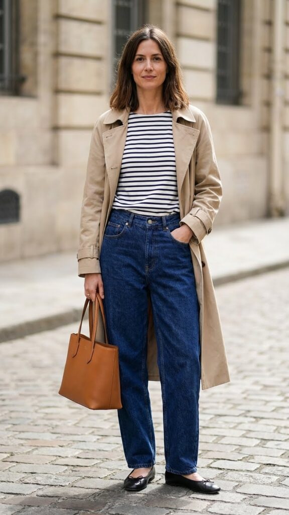 The trench coat elevates everything instantly, making you look way more polished than you feel. Keep your shoes simple with ballet flats or minimalist sneakers, and add a structured tote bag to complete the vibe. This is perfect for those in-between weather days when you need layers but don’t want to look bulky. Plus, you can dress it up for a casual work day or keep it relaxed for weekend plans. Versatility is the name of the game here.