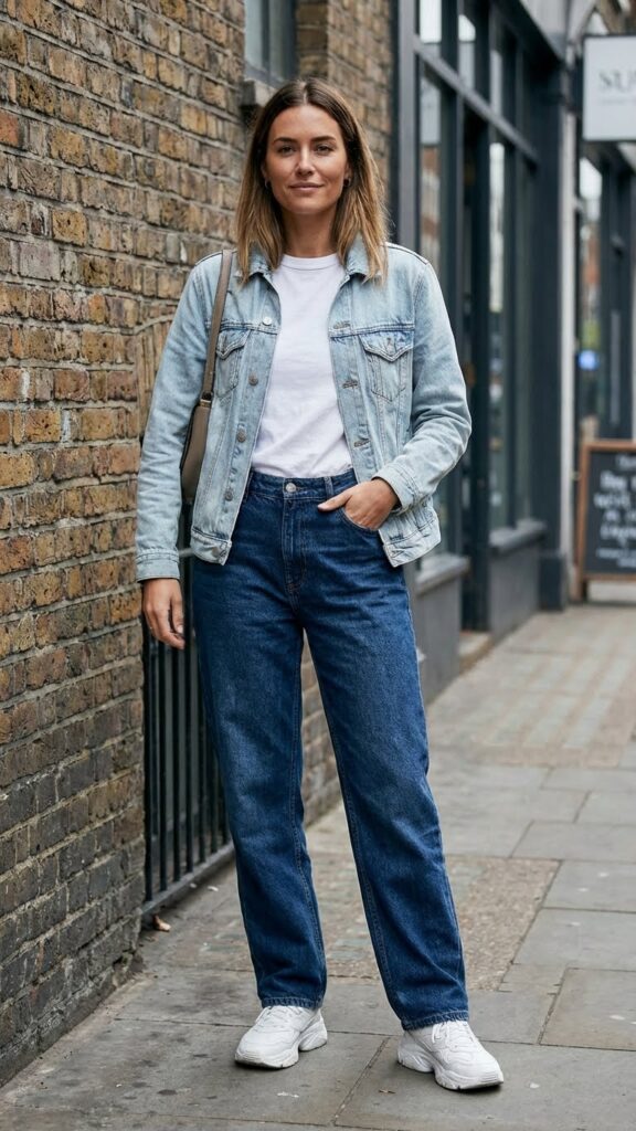 Style with a simple white tee or striped shirt underneath, and keep your shoes clean and minimal with white sneakers or ankle boots. The key to pulling off double denim is confidence and making sure the fits are different. Your baggy jeans are relaxed, so keep the denim jacket more fitted for balance. Add some gold jewelry and a fun bag, and you’ve got a look that’s casual but considered. This outfit is giving effortless cool without trying to be trendy, which honestly is the best kind of style.